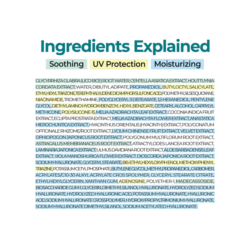 Formulated with 49.8% calming herb extract, this sunscreen delivers more than sun defense. Infused with Houttuynia Cordata, Centella Asiatica, and licorice root water, it soothes irritation, reduces redness, and locks in moisture. The addition of 10 types of hyaluronic acid creates a hydrating barrier, leaving your skin refreshed and plump throughout the day.