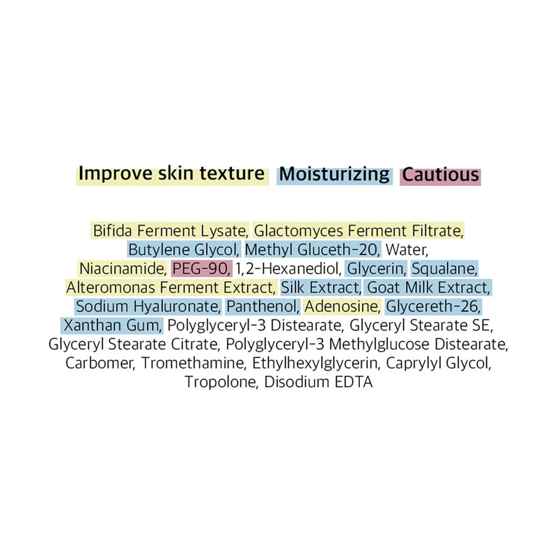 The key ingredients include Bifida Ferment Lysate to strengthen the skin barrier, Galactomyces Ferment Filtrate to brighten and refine texture, and hydrating agents to keep skin plump and smooth. Clinical tests show a 30.9% reduction in pore area and an 11.4% decrease in roughness in just two weeks.