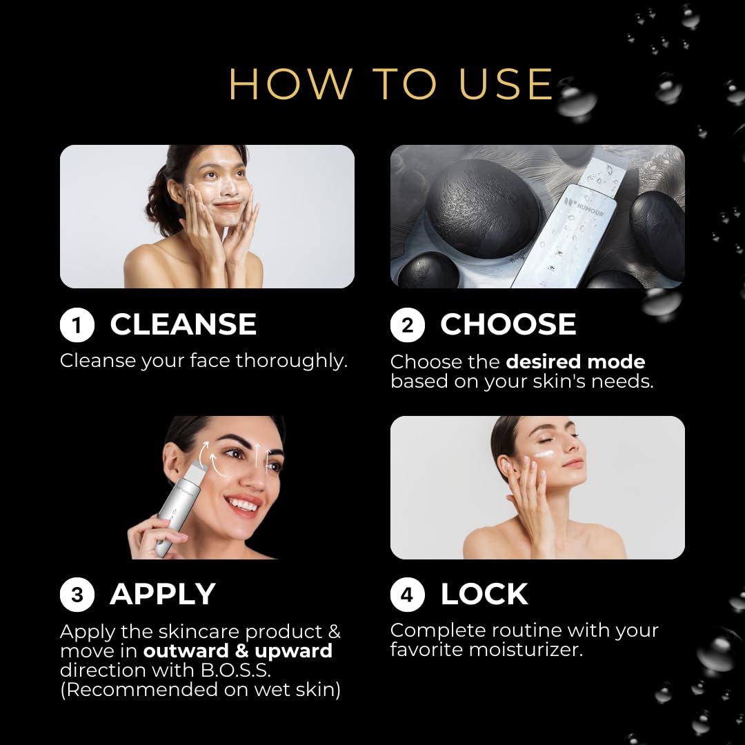 India's first Dermatologist-Approved sonic scrubber designed to revolutionize your skincare experience. B.O.S.S. is your ultimate ally for achieving smooth, radiant skin. With a powerful combo of Cleanse, Lift, Exfoliate, and Nourish, it's an all-in-one for every skincare lover. This cutting-edge companion combines Ultrasonic Technology, EMS Microcurrents, and LED Light Therapy to maximize the effectiveness of your daily skincare regimen. Customizable modes cater to a wide range of skincare needs, from deep cleansing and skin lifting to acne reduction and anti-aging treatments. It can be used with cleanser, toner, cream, serum, and even a mask for every step of your skincare.