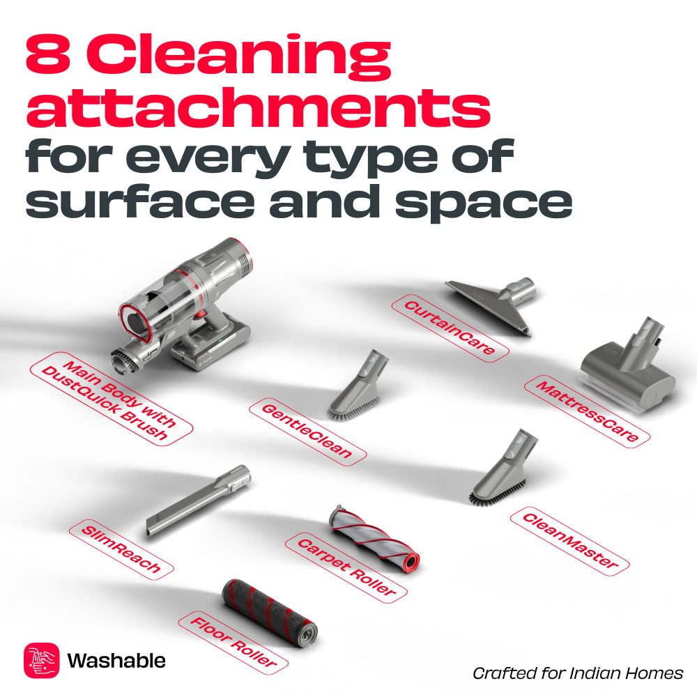 Meet REN PRO — engineered with 34kPa suction power, an 80,200 RPM BLDC motor, and up to 60 minutes runtime. Built for real Indian homes and real messes. Smart Adaptive Suction™, FlexiStick™ bending rod, and 8 precision attachments make deep cleaning effortless.
