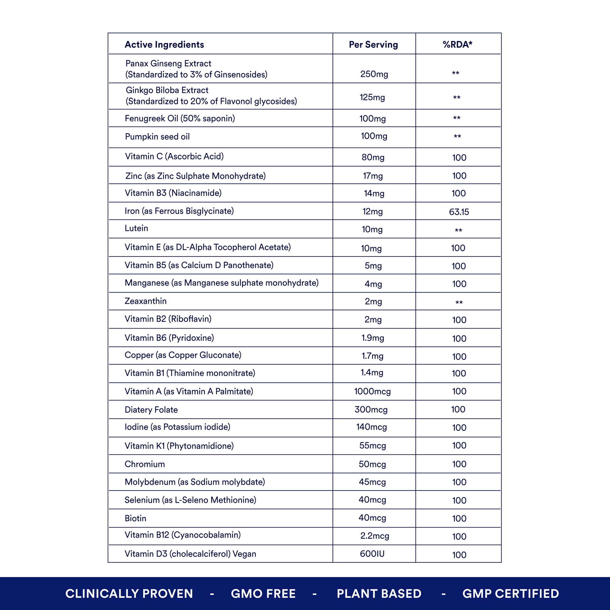 | Formulation | Vitamins, minerals, and herbal ingredients |