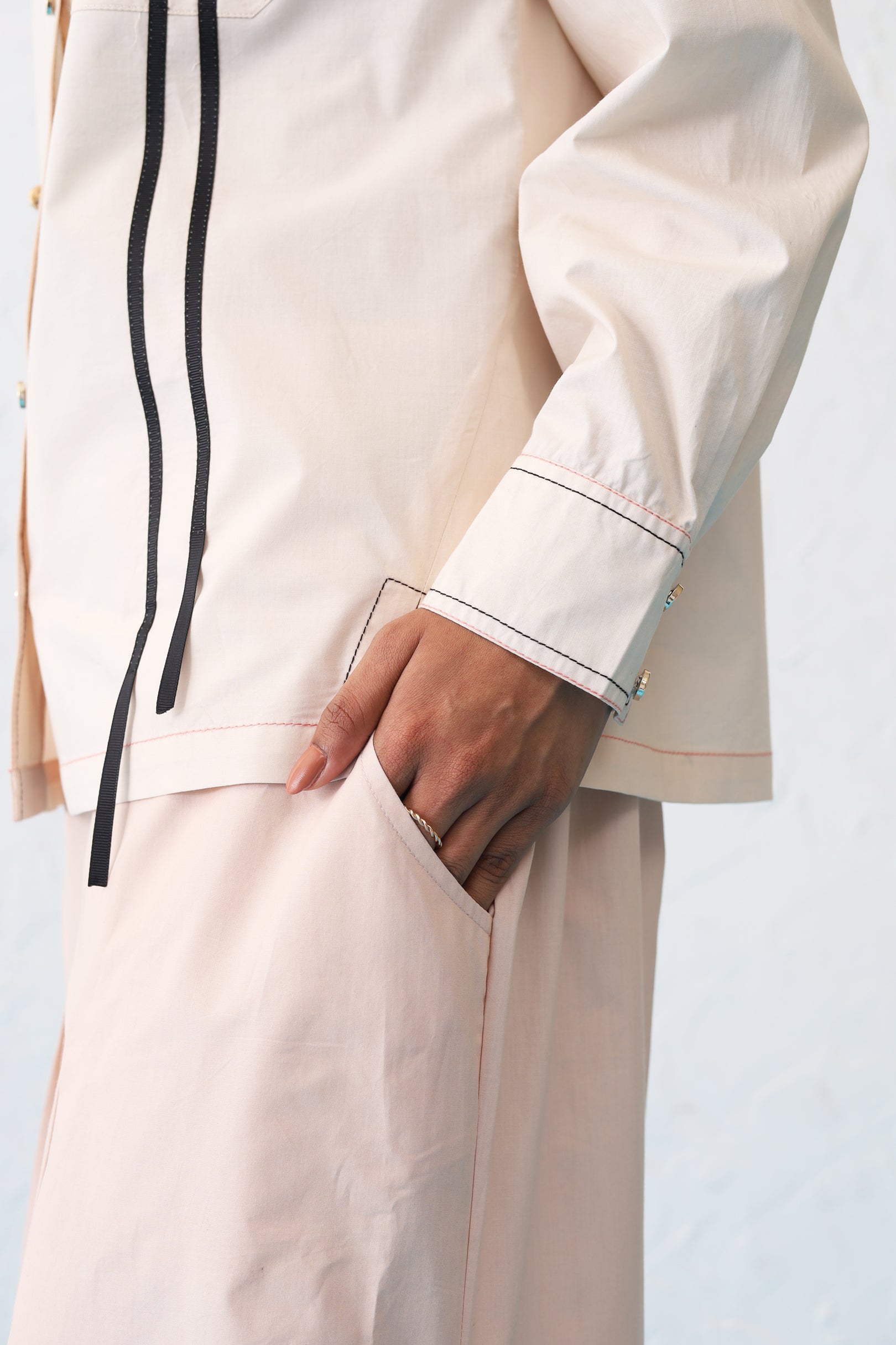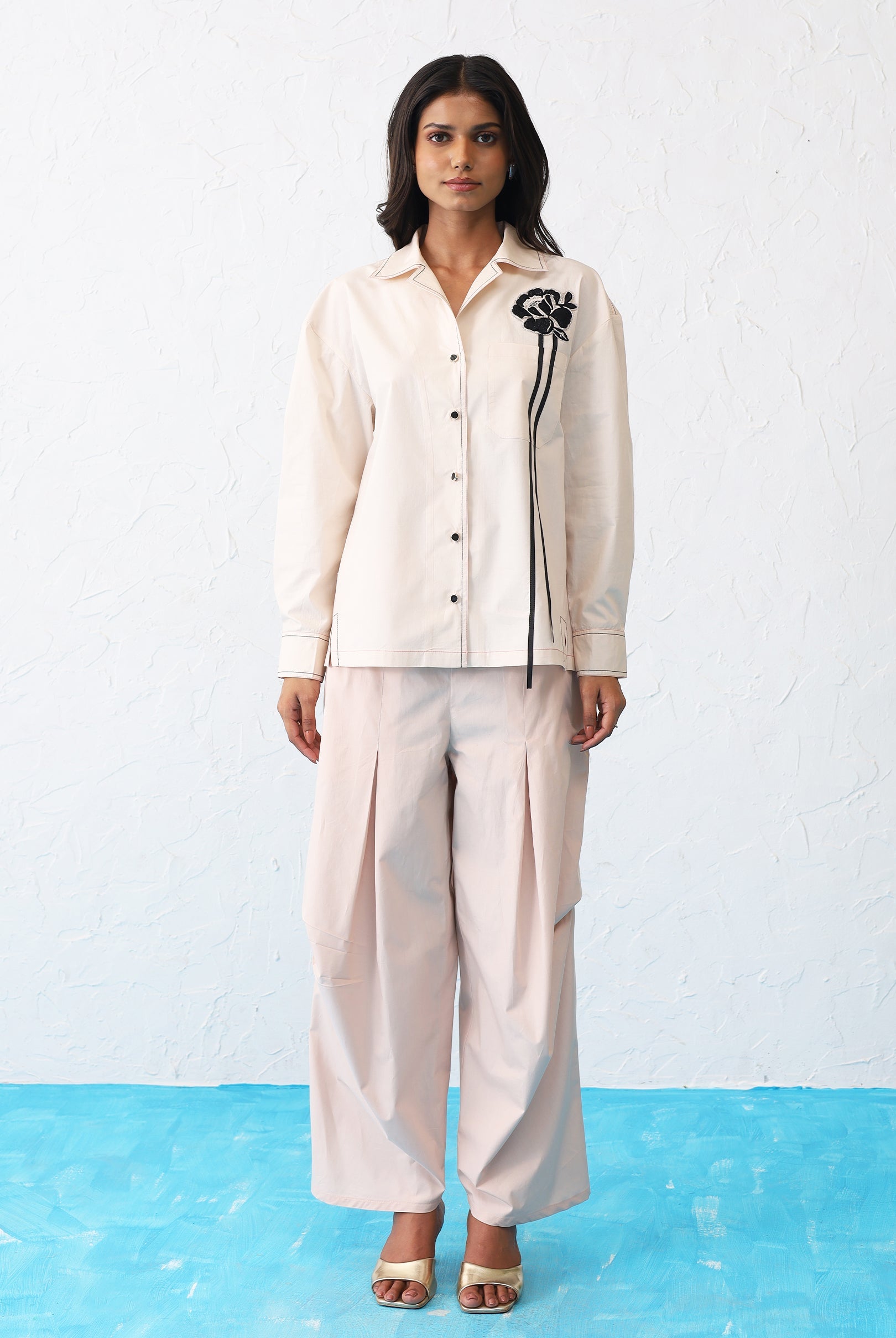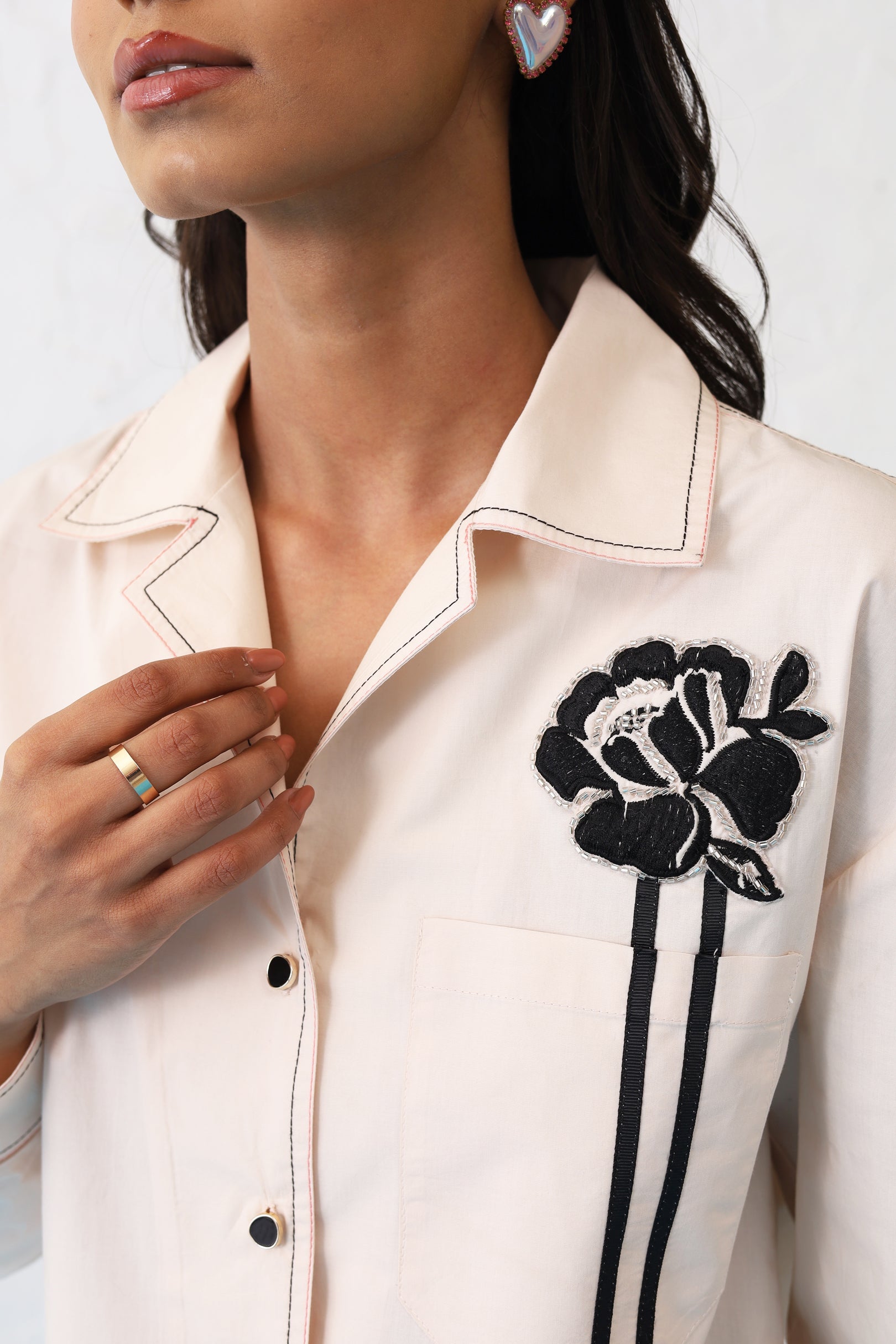 Indulge in timeless elegance with this beautiful shirt. An embroidered rose adds a touch of femininity and romance, while the black tape detailing provides a touch of modern edge.