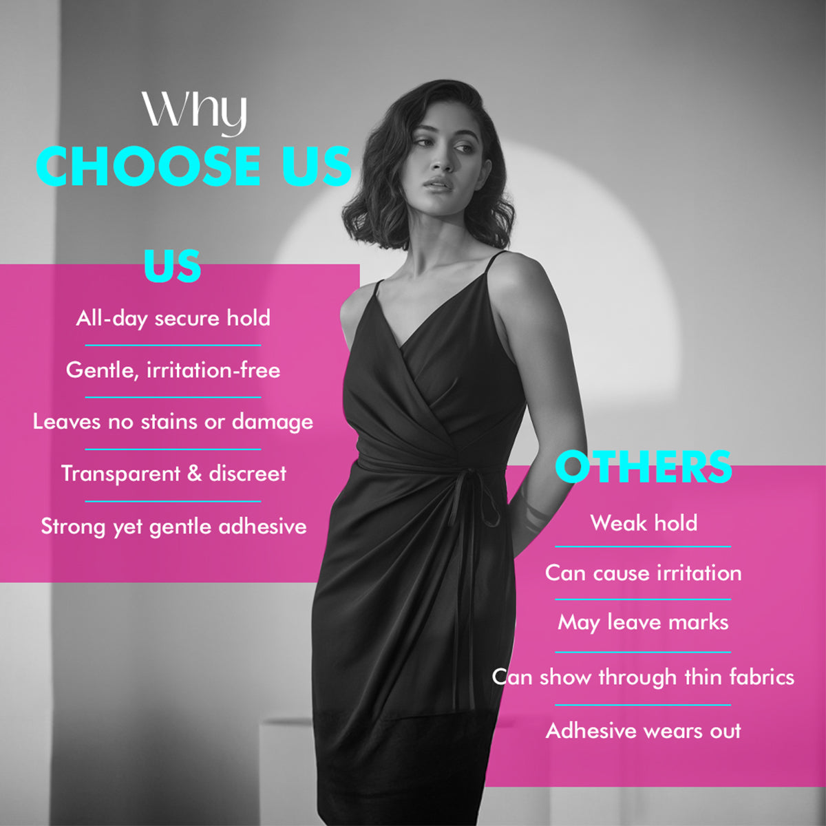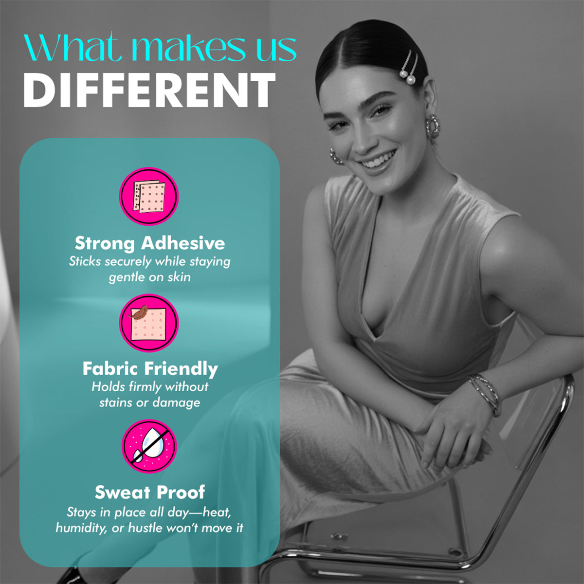 Powered by SkinEAZE⢠technology, the advanced adhesive delivers irritation-free comfortâgentle on sensitive skin yet strong enough to hold all dayâwhile InvisiSKIN⢠technology ensures the transparent tape blends seamlessly with both fabric and skin. The result? A flawless, no-show finish that stays discreet, keeps everything in place, and gives you effortless confidence in every outfit (and every selfie).