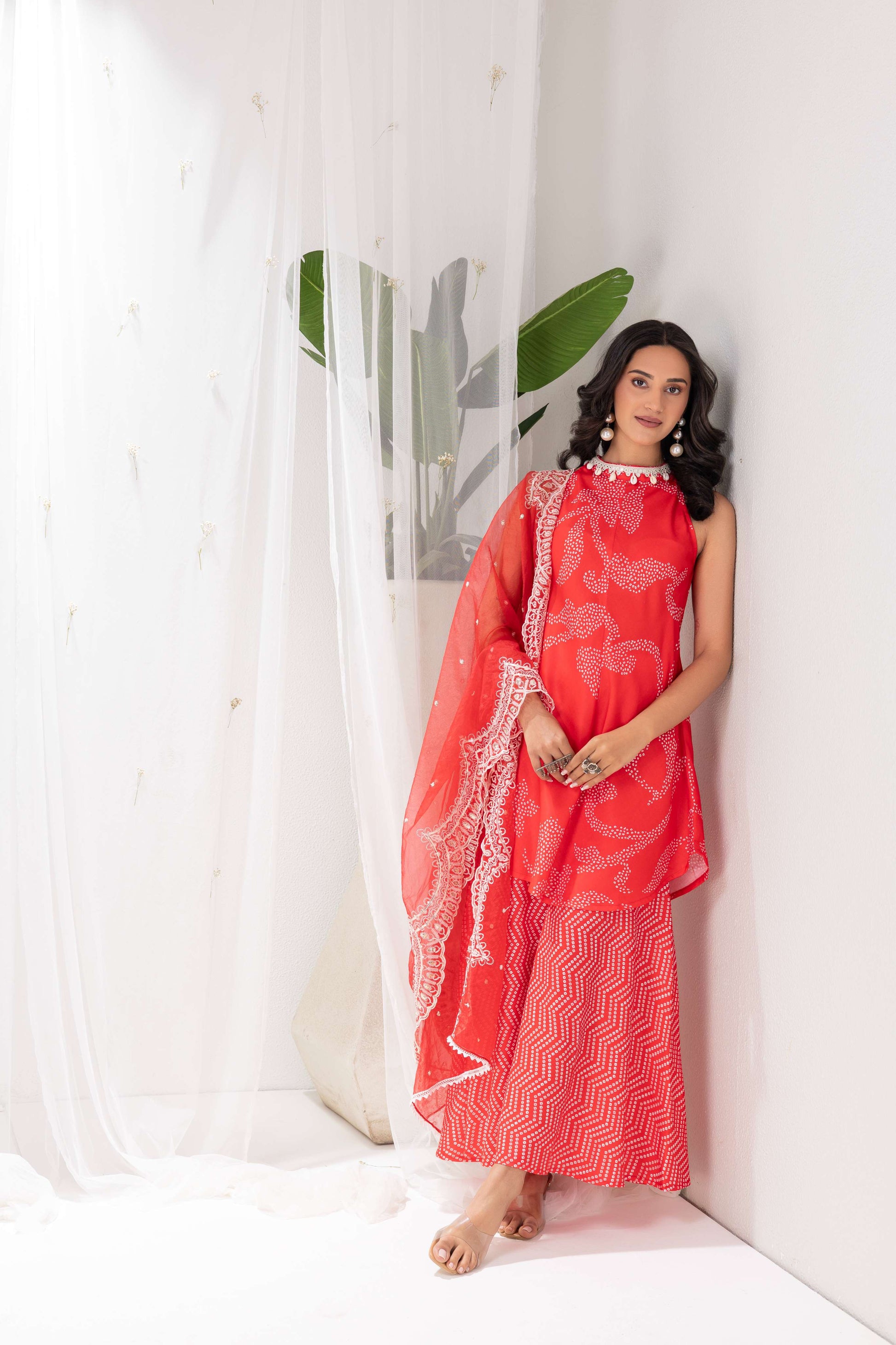 Make a bold statement with this Bandhani Printed Halter Suit Set — a contemporary twist on traditional charm. The halter neckline adds a modern touch, while the beautifully printed wide-leg palazzo ensures comfort and elegance in equal measure. Perfect for festive occasions, intimate gatherings, or stylish celebrations, this set delivers effortless grace with every step.