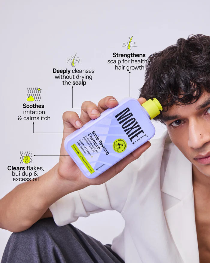 The Scalp Reviving Shampoo is a sulphate-free formula clinically designed to treat dandruff at the root — not just wash away flakes. Powered by Piroctone Olamine, AHA‑BHA exfoliants, and Shikimic Acid, it targets the root causes of dandruff—excess oil, buildup, and microbial imbalance.