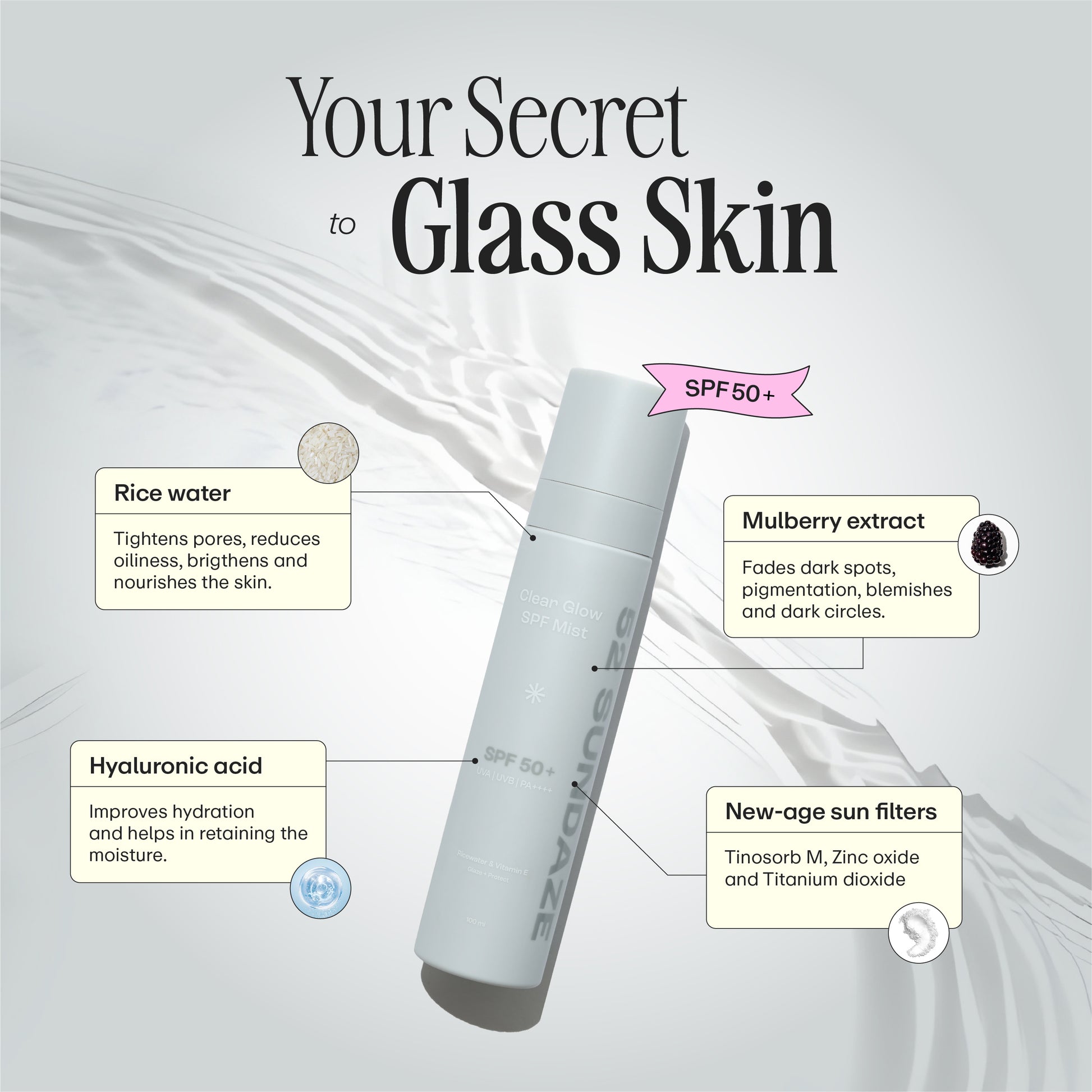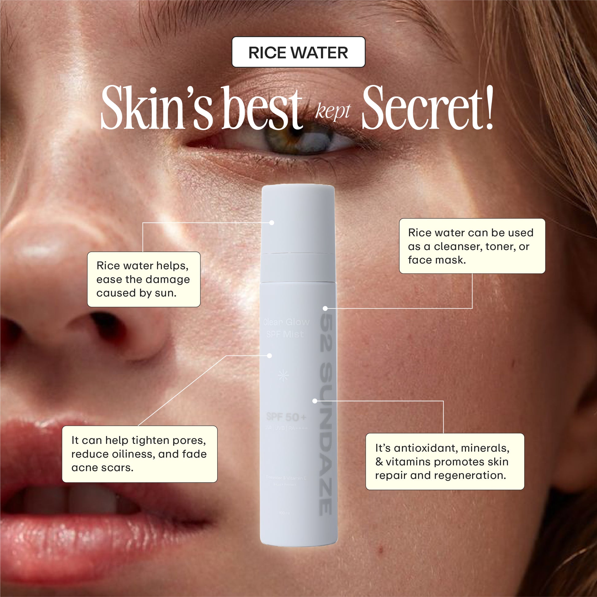 52 Sundaze Rice Water Sun Mist SPF 50 — a revolutionary blend of ancient Korean beauty secrets and modern skincare technology. This lightweight, alcohol-free mist offers powerful sun protection while deeply hydrating and brightening the skin. Infused with nourishing Rice Water, Vitamin E, Aloe Vera, Mulberry, and Hyaluronic Acid, it keeps your skin soft, plump, and radiant. Perfect for quick reapplication over makeup, this mist makes sun protection effortless, refreshing, and fun. Crafted for all skin types, especially oily skin, without any white cast or greasiness.