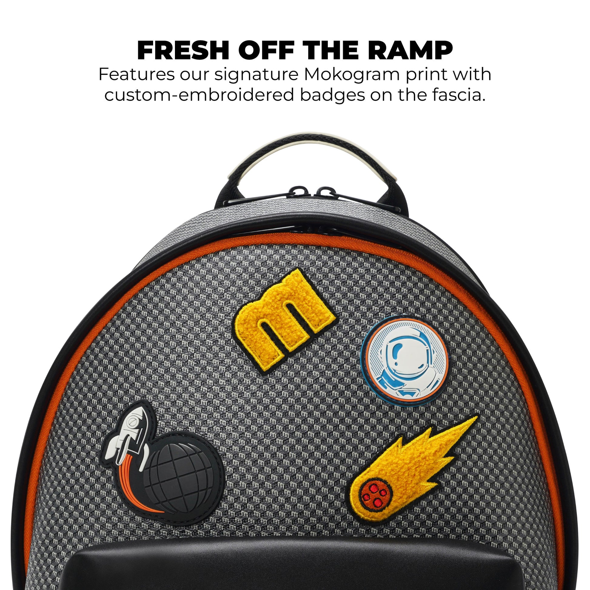 Features our signature Mokogram print and vegan leather trims. Custom-embroidered badges on the fascia. Quick access zipper pocket on the front.