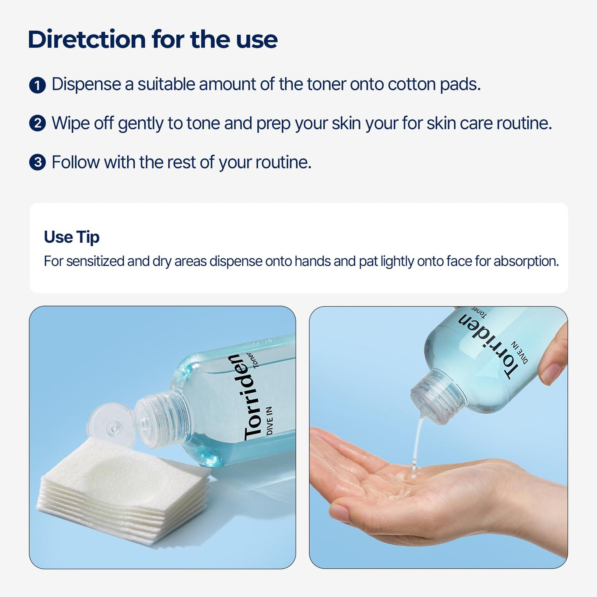 The award-winning and viral Torriden Dive In Toner is a deeply moisturizing and soothing toner infused with 5-D Complex Hyaluronic Acid to replenish skins moisture levels, keep skin supple and soften skin with each application. 5 different molecular sizes of Hyaluronic Acid moisturize the skin on several levels, and bind moisture to keep the skin hydrated for a long time.