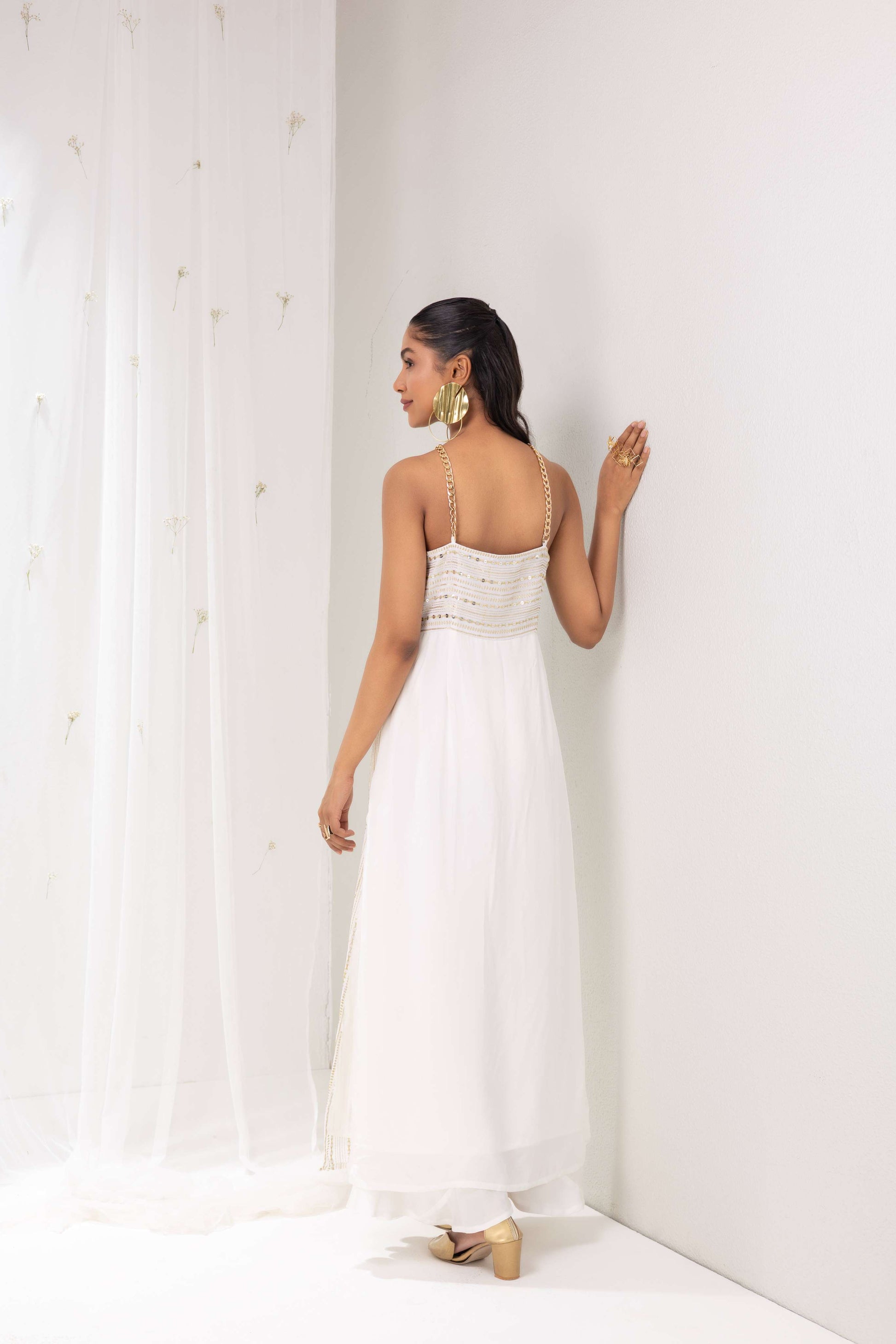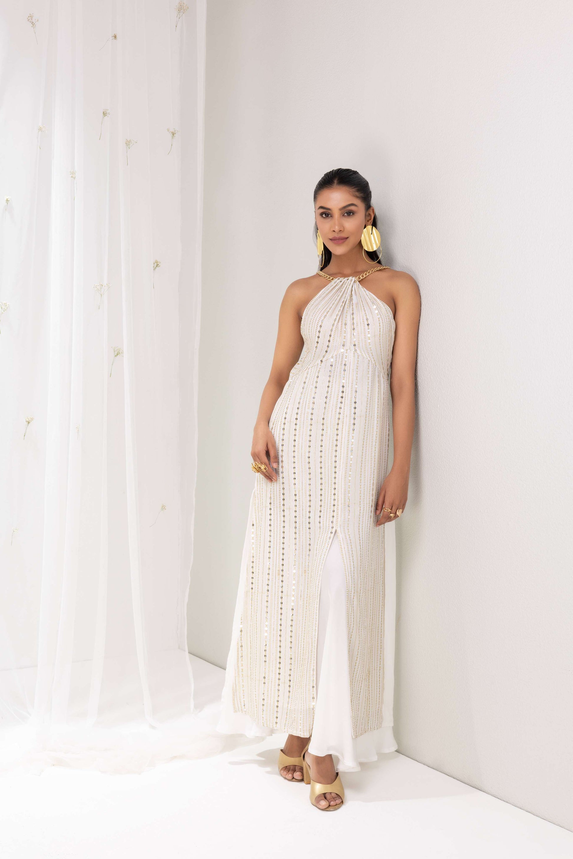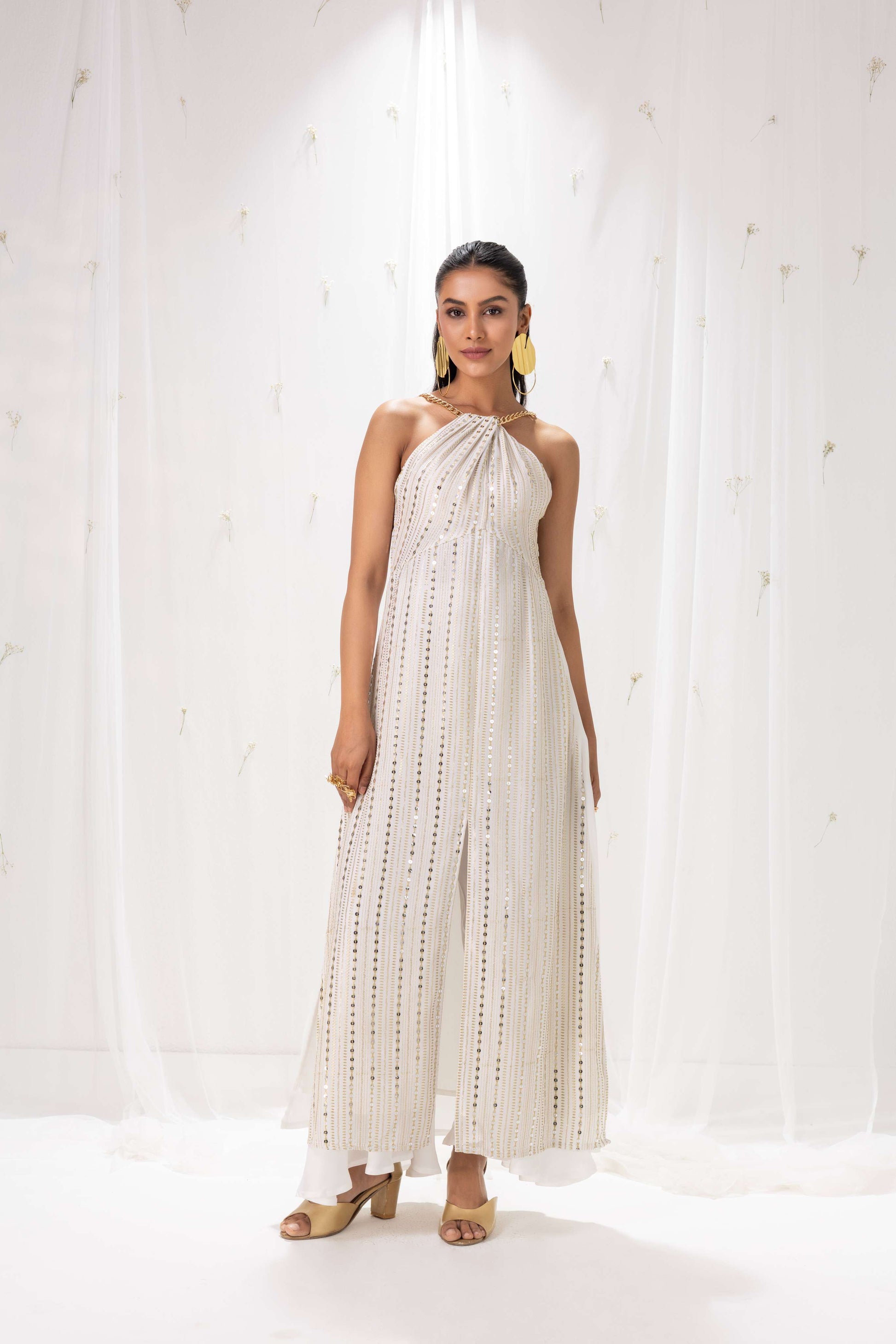 Step into festive elegance with this White & Gold Sequin Embroidered Kurta Set, designed for modern celebrations and special occasions. The statement gold chain halter neck adds a luxurious charm, while the shimmering sequin embroidery enhances the outfit with a festive glow. Paired with coordinated bottoms for a balanced and graceful silhouette, this set is perfect for weddings, parties, and celebrations where you want your style to shine effortlessly.