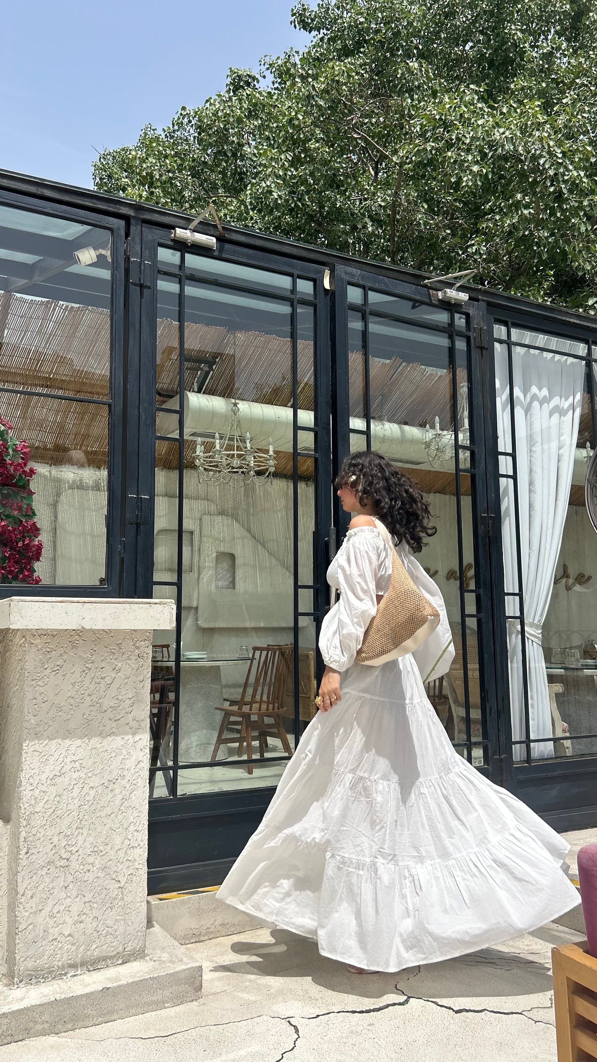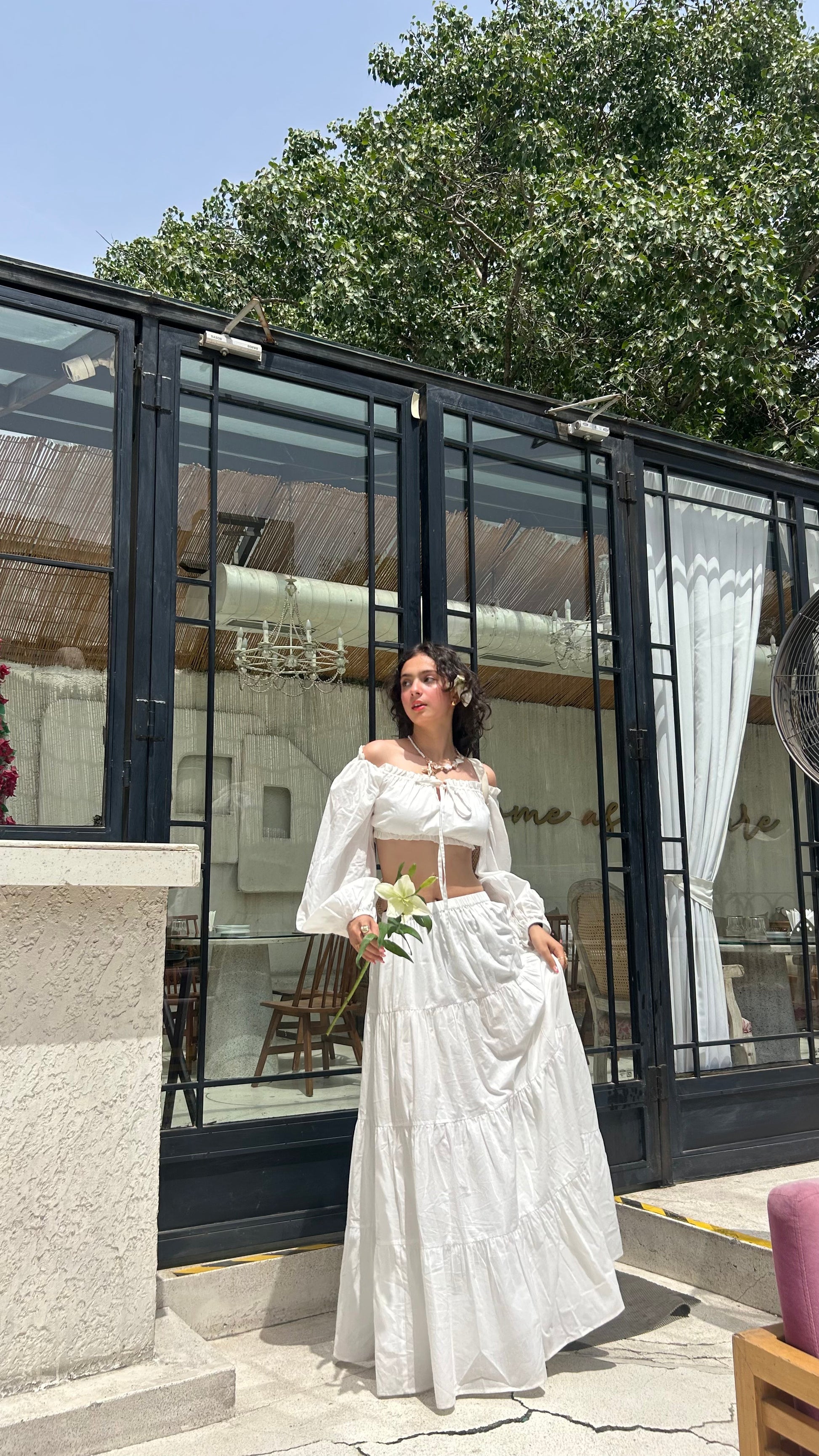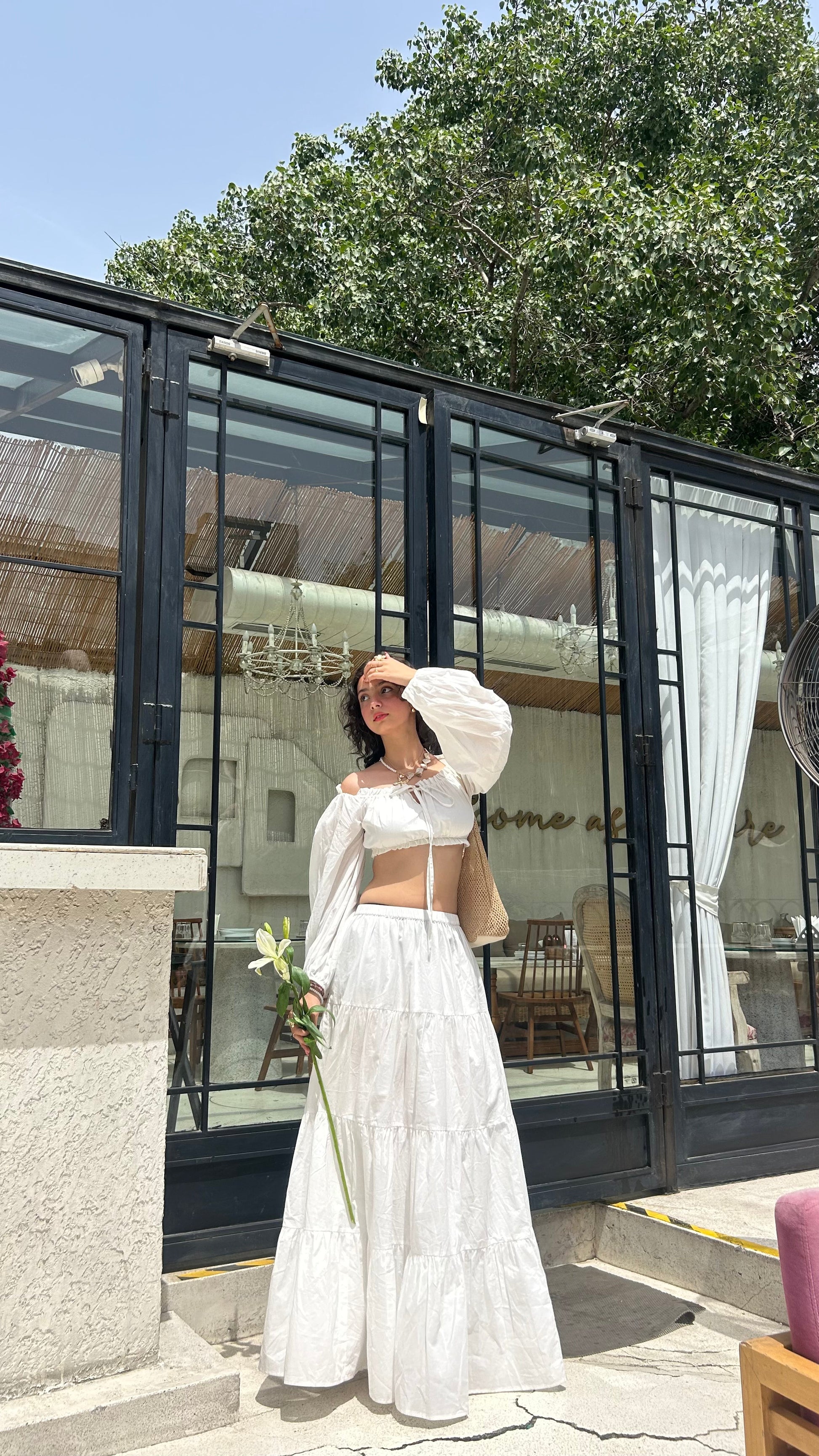 This White off-shoulder crop top features a gathered bodice with a front tie-up detail, offering a soft, romantic silhouette. The balloon sleeves add volume and elegance, making it a standout piece for summer outings. Crafted from lightweight, breathable fabric, it ensures comfort while enhancing your feminine charm.
