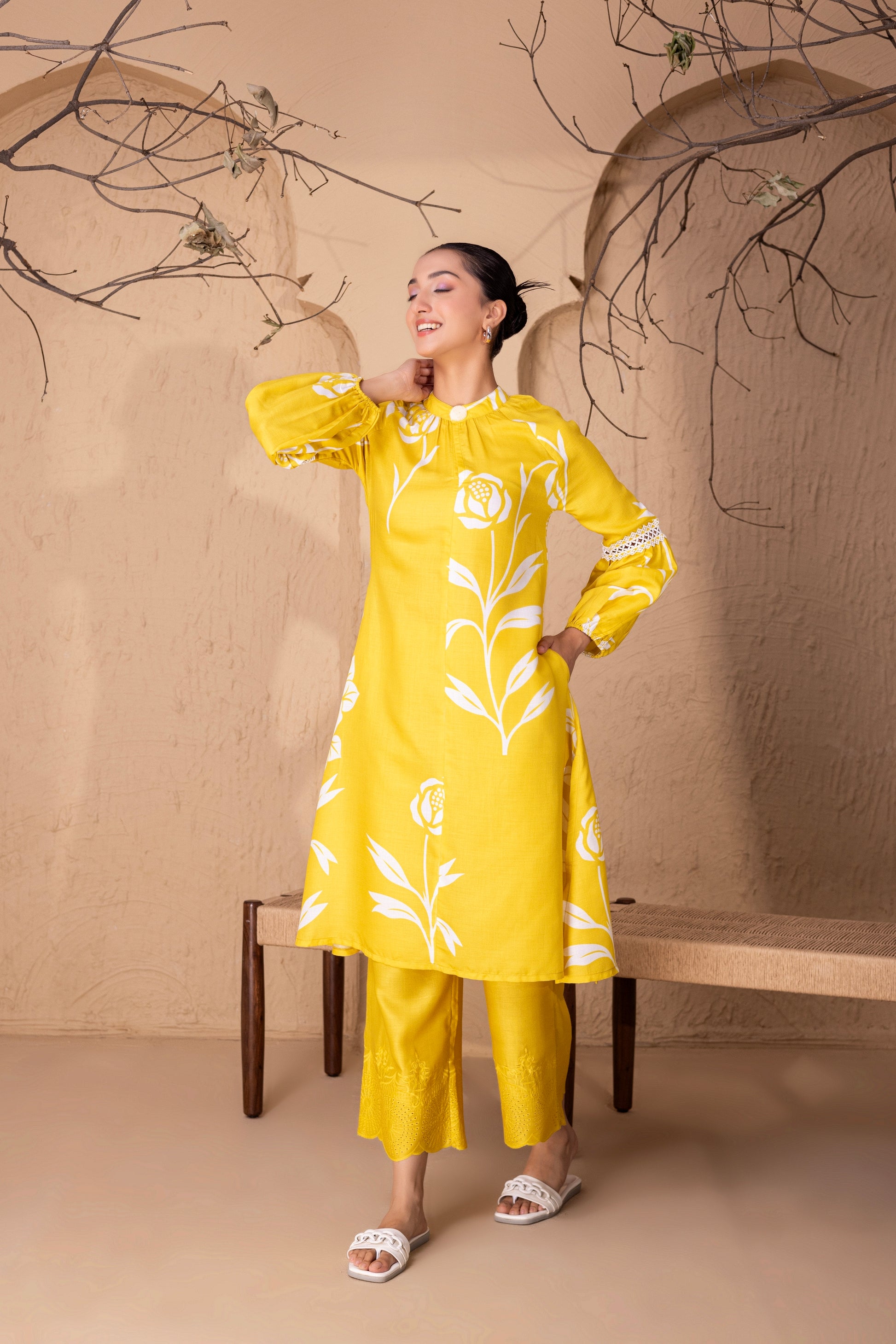 Brighten up your everyday style with this Yellow Floral Printed Kurta Set, crafted in soft viscose for all-day comfort. The white floral print adds a fresh and elegant charm, while the long balloon sleeves and band neck with button detailing elevate the modern-traditional look. Paired with complementary bottoms, this relaxed-fit outfit is perfect for casual outings, office wear, festive brunches, and summer gatherings.